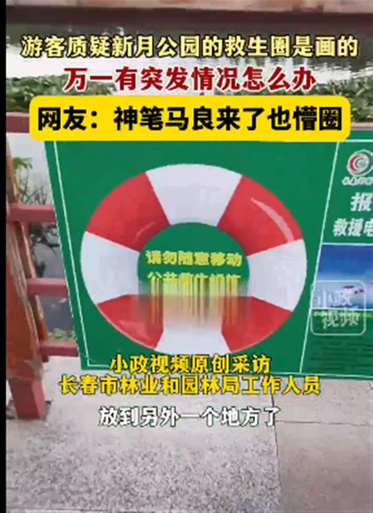 8月13日,有网友反映长春市新月公园水池边设置的救生圈是画上去的,只是一张与原物一样大的牌子,上面写着“请勿随意移动公共救生设施”,而实物并不存在,质疑园方搞形式主义。“万一有啥突发情况怎么办?”游客质疑说。(据8月14日大皖新闻报道)