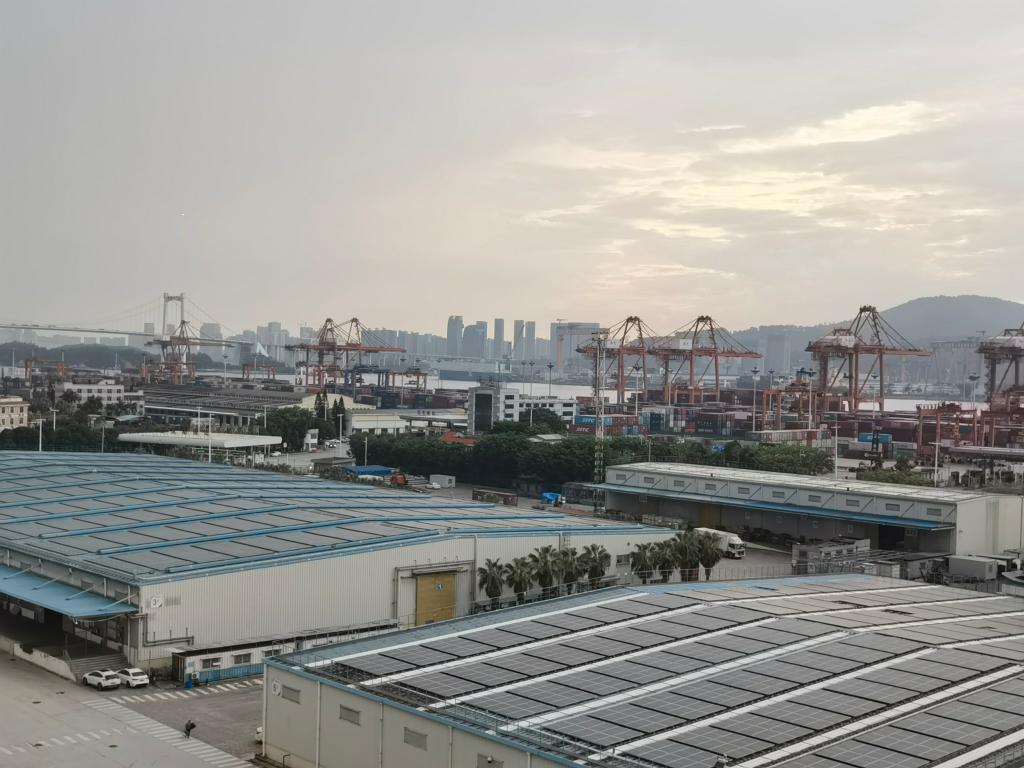 象屿综保区还通过构建绿色能源体系,做好能源降耗减碳“加减法”。从高处俯瞰,综保区仓库屋顶一块块光伏发电板整齐排列,形成一个个屋顶“发电厂”。目前,其光伏发电板铺设面积约6万平方米,年发电量970余万度。