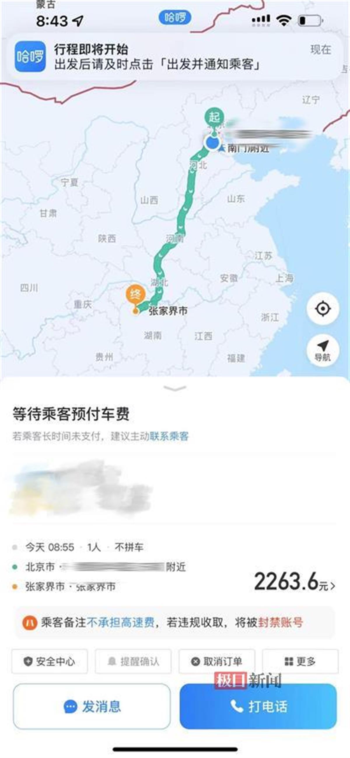 8月14日,刘先生告诉极目新闻记者,今年5月,他准备和父亲从河北自驾到湖南旅游,出发前,在哈啰顺风车上接到一笔从北京前往张家界的订单。因乘客称担心线上定位不准,两人还加了微信。双方沟通好后,于5月22日上午出发,23日早上抵达乘客目的地,全程约1400公里,顺风车平台显示车费是2263.6元。出发前乘客曾表示自己会出高速费600元,这样,刘先生本该收到2800余元的车费。