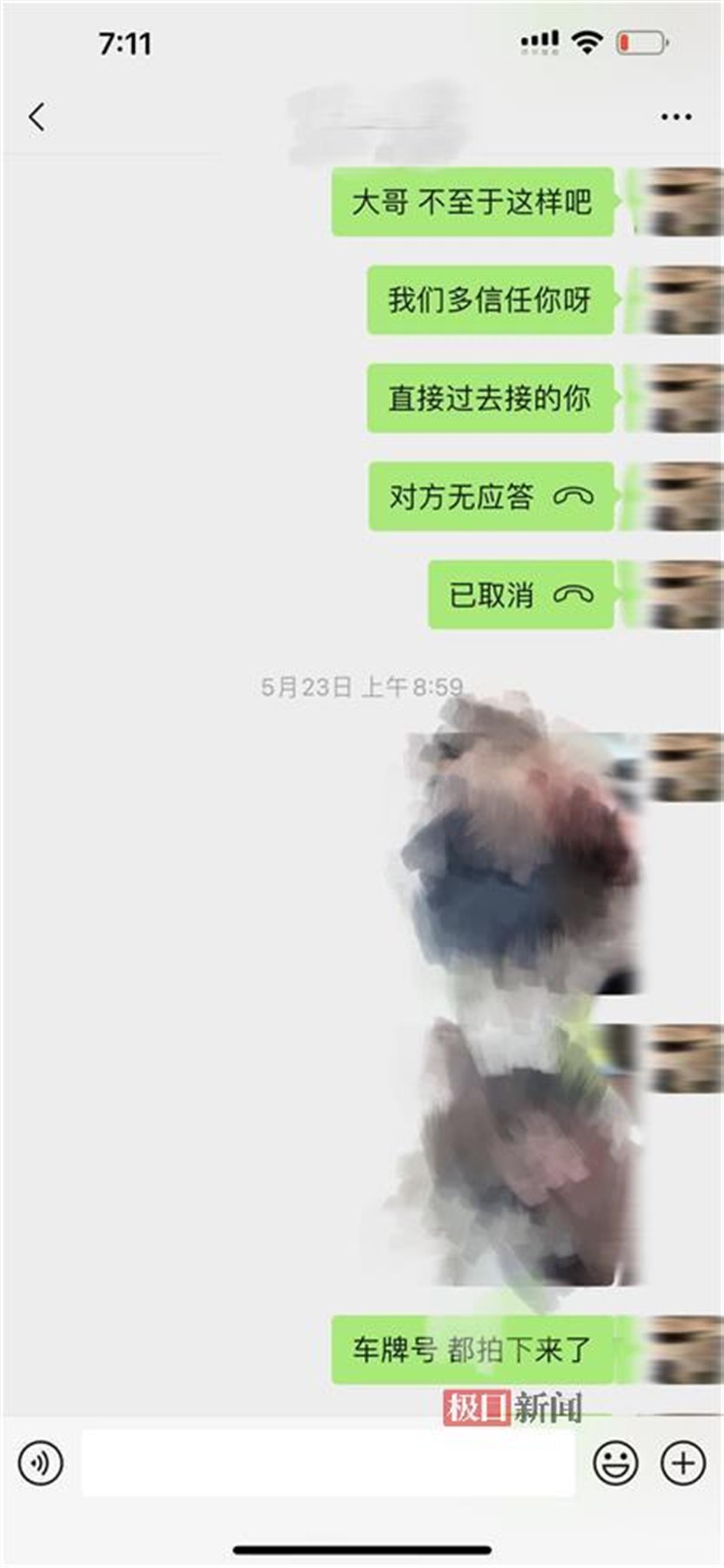 刘先生提供的与乘客的聊天记录显示,5月23日8时50分许,他给对方发消息称:“不至于这样吧,我们多信任你,直接过去接的你。”随后他拨了两次电话,对方未接听。此后,刘先生多次与对方沟通,并表示已经报警。5月23日11时许,刘先生拨通了乘客电话,对方称可以给1500元车费,其银行卡被封了。刘先生发去收款码后,对方又称自己当时拿不出来钱没法转账,会想办法,最迟到第二天晚上给钱。双方继续沟通。聊天记录显示,5月24日20时开始,刘先生发出的多条微信消息被拒收,疑似已被对方拉黑。