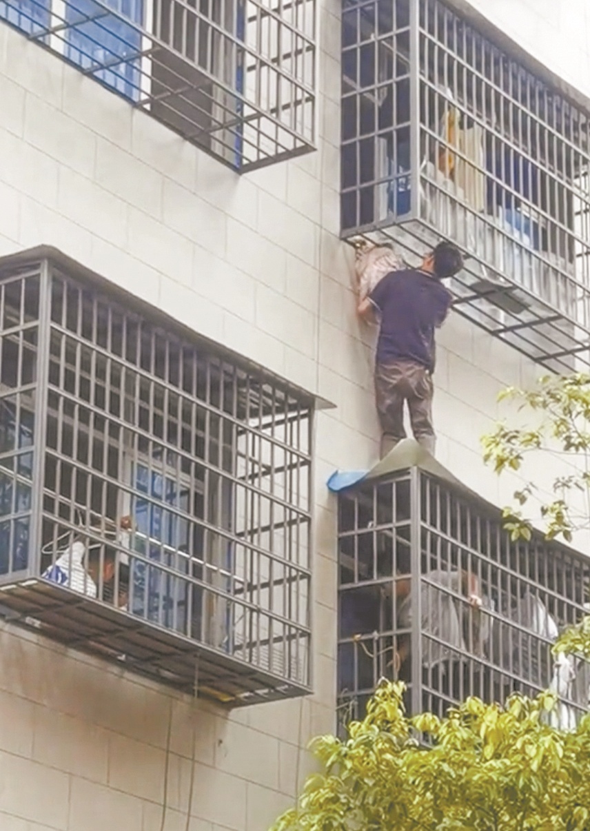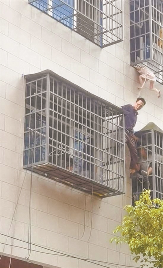 杨双:说实在的,爬出去的时候没有觉得害怕。我们本来就是做门窗这个行业的,知道哪个地方能够承受我的重量,哪个地方踩了可以给予支撑点,所以也没有恐高。之前在工作中安装或修理防盗窗时,28层楼顶都坐过。但这次把小朋友顶上去了,准备下来的时候,高度紧张的状态一下子放松了,我感觉腿有点发抖。