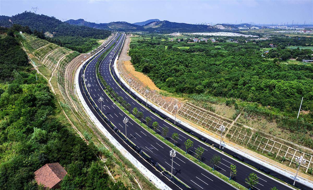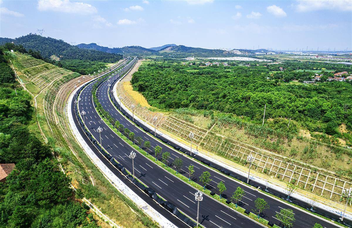8月14日,鸟瞰武汉江夏区山湖大道。目前,大道路面平整干净,标线分明,绿化工程完工,全路段多功能智慧路灯已全部安装到位。全长约12.4公里,双向八车道的山湖大道通车在即。