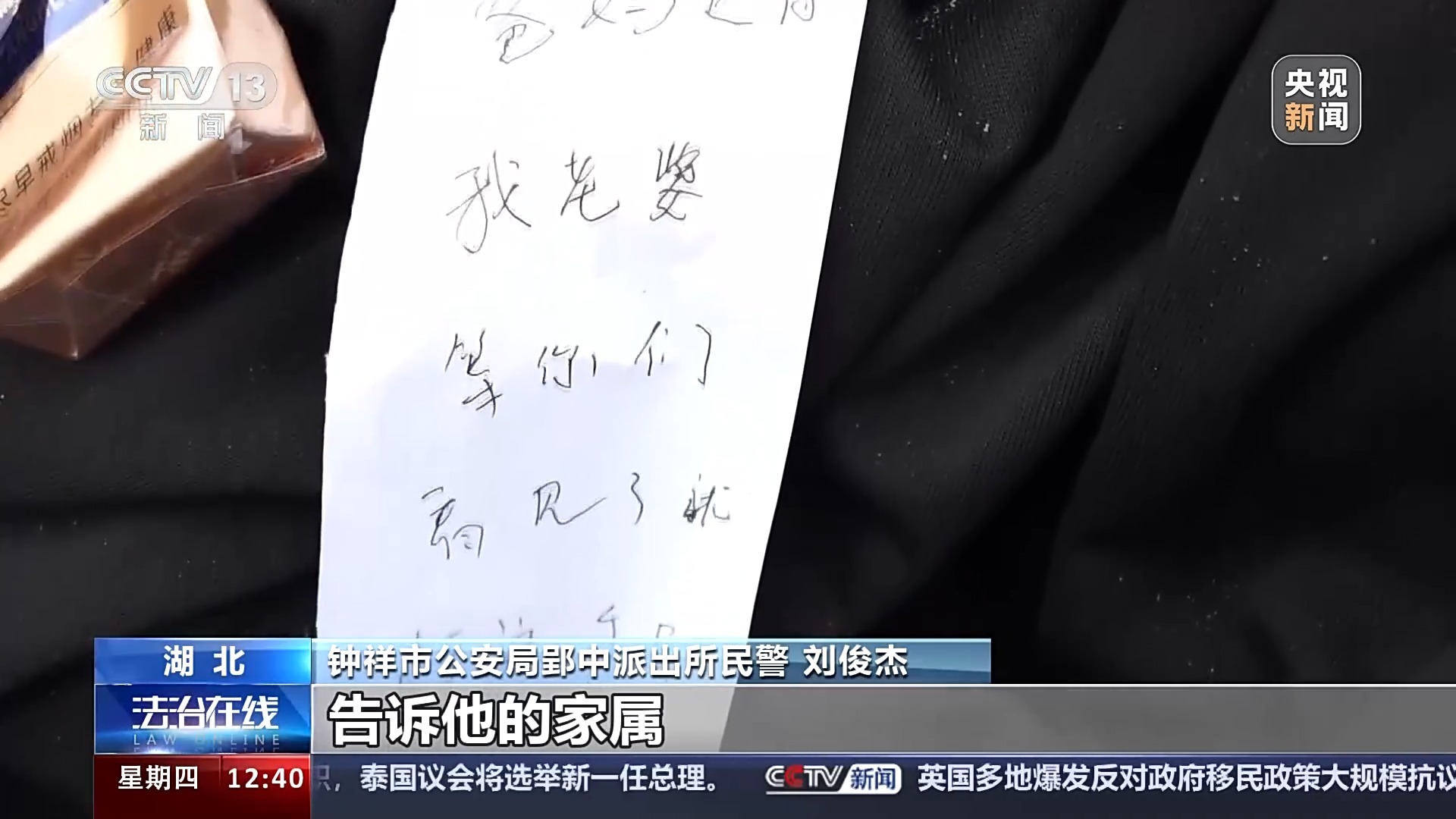 钟祥市公安局郢中派出所民警 刘俊杰:纸条写的是不要把他跳河的事情告诉他的家属,请拨打一个电话号码。然后我们当时也立即地拨打这个电话号码,拨打过去发现这个人也是他的一个亲戚,是他爱人的哥哥。
