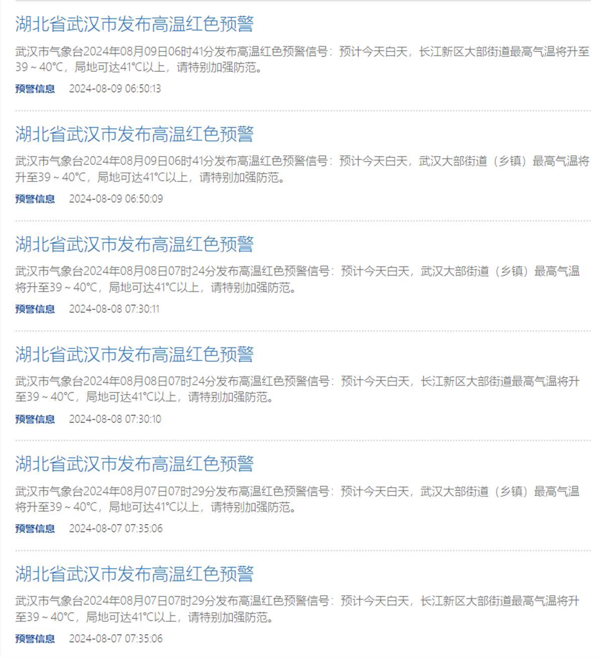 中伏期间,由于副热带高压加强西伸,多地出现了超40℃的极端高温天气。极目新闻记者梳理发现,截至目前,7月24日、8月7日、8月8日、8月9日,是武汉今夏最热的4天。进入三伏天以来,武汉市气象台共有25天发布了高温预警信号。其中,9天发布高温黄色预警信号(连续三天日最高气温将在35℃以上)、12天发布高温橙色预警信号(24小时内最高气温将升至37℃以上)、4天发布高温红色预警信号(24小时内最高气温将升至40℃以上)。8月7日至9日,武汉最高气温升至39~40℃,局地达41℃以上。