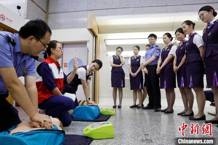 列车员在急诊科护士长杨炯的指导下进行心肺复苏急救训练。中新网记者 殷立勤 摄