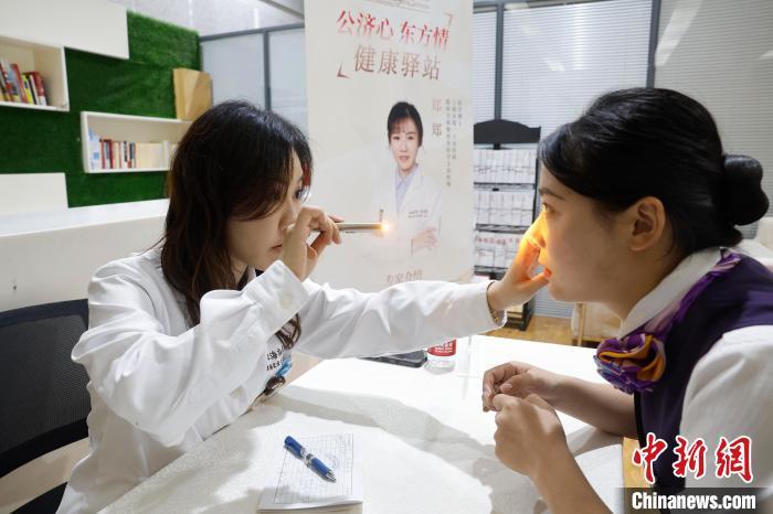 眼科医生郑郑为列车员检查视力。中新网记者 殷立勤 摄