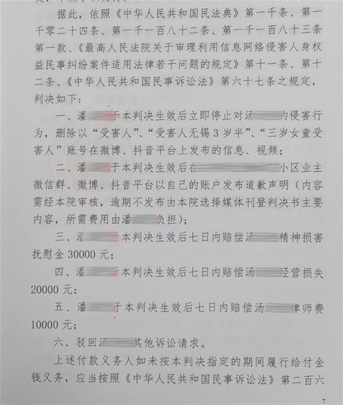 该案一审民事判决书显示,法院判令潘某洁立即停止对汤先生的侵害行为,删除以“受害人”“受害人无锡3岁半”“三岁女童受害人”账号在微博、抖音平台上发布的信息、视频,在小区业主群、微博、抖音平台以自己的账户发布道歉声明,赔偿汤先生精神损害抚慰金3万元、经营损失费2万元、律师费1万元。