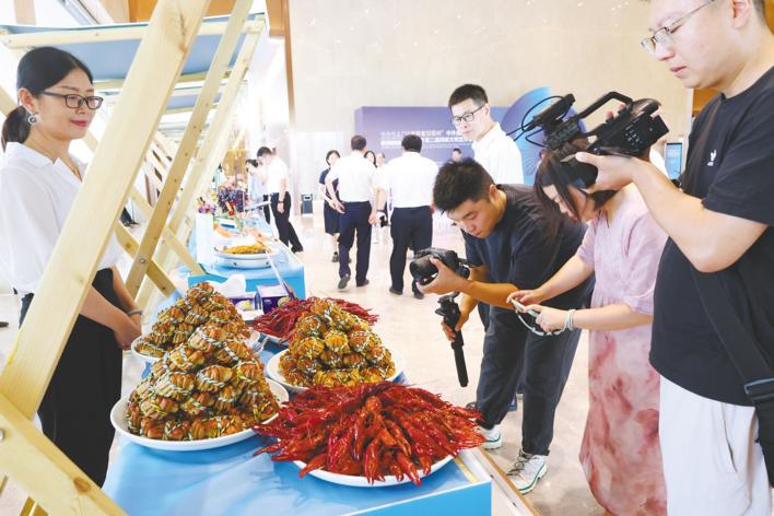 “鲜!”室外大厅,波士顿龙虾、泰国榴梿、智利三文鱼、梁子湖大闸蟹、烟台樱桃等鲜货一字排开,吸引众多记者驻足拍摄品尝。
