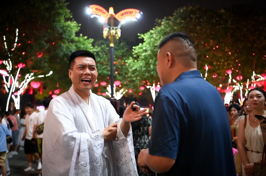 西安大唐不夜城的演员“李白”与游客对诗。 邹竞一 摄