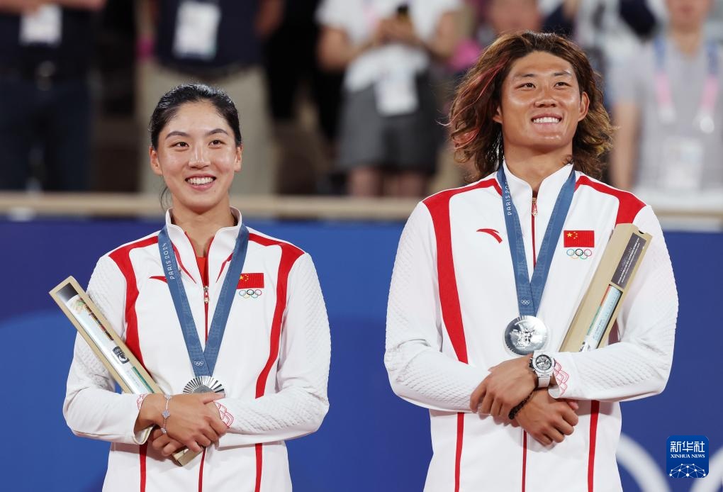 8月2日,银牌得主中国组合王欣瑜(左)/张之臻在颁奖仪式上合影。 当日,在巴黎奥运会网球混合双打金牌赛中,中国组合王欣瑜/张之臻1比2不敌捷克组合西尼亚科娃/马哈奇,获得银牌。 新华社记者 高静 摄