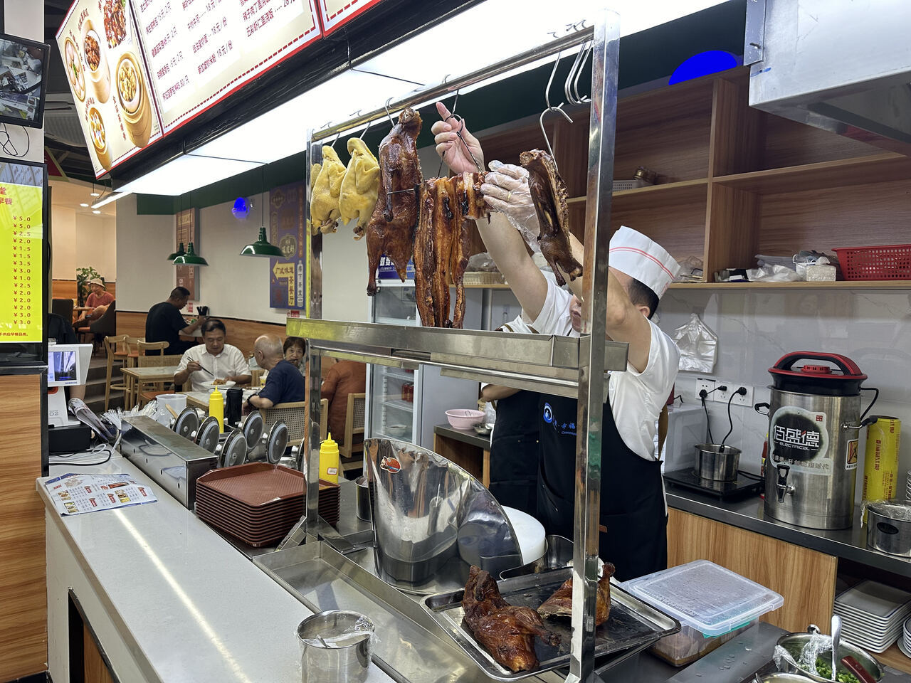 记者循着香味,找到了这家位于近江南路上的幸福邻里食堂。宽敞透明的腊味专窗里,琥珀色的叉烧、烧鸭向下滴着油,外皮烤得焦黄香酥。“所有烧腊均为当日现烤、现切。”一位来自广东的厨师忙活于厨房案前,切剁声不绝于耳。