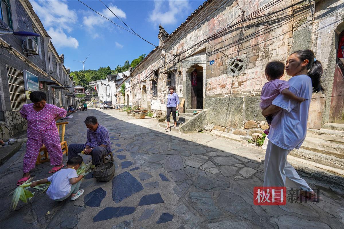 漫步在村内,一条百余米长的老石板路从两排房屋中间穿过,其中一排老旧房屋都是白墙黑瓦的徽派建筑。石条制作的台阶,石头制作的大门门框,木制的阁楼……这些旧建筑诉说着过去的岁月,至今仍有村民在里面生活。