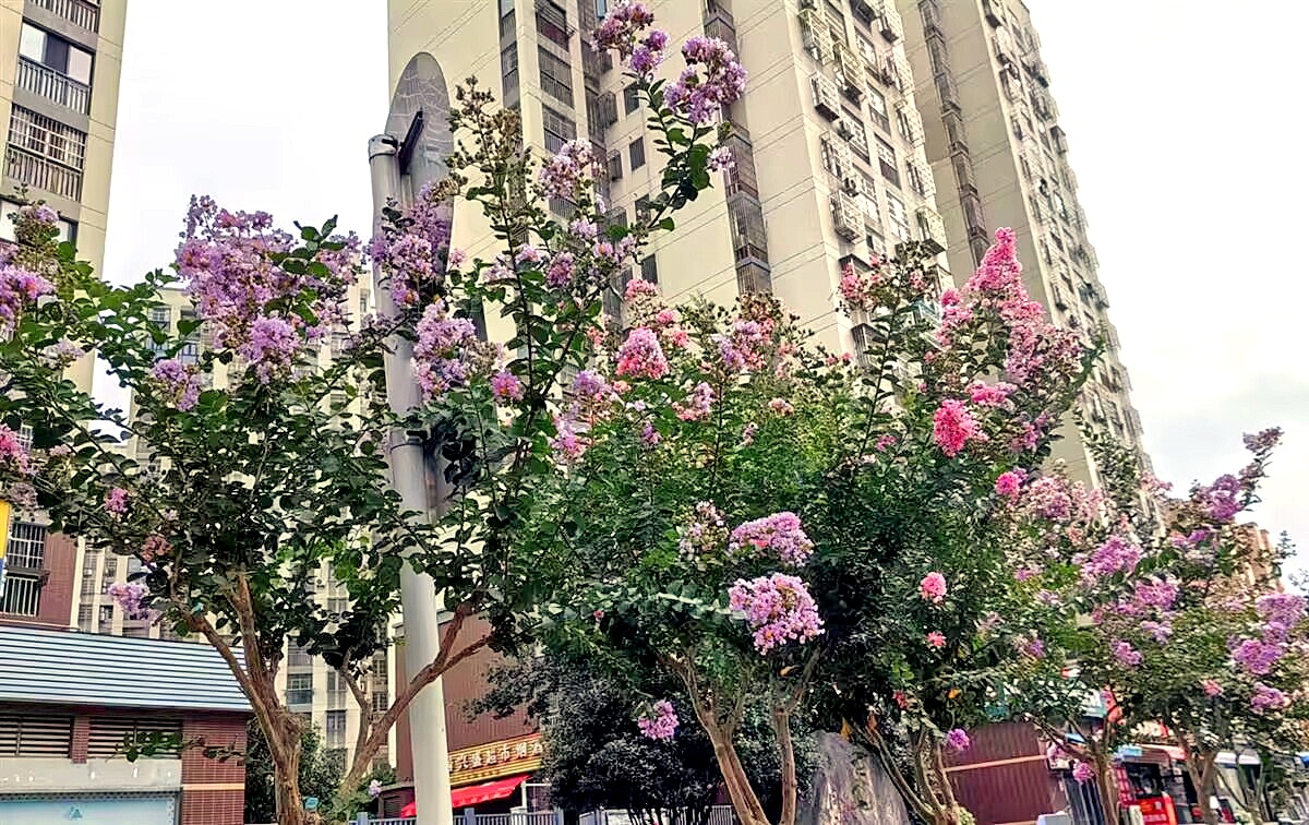 8月15日,位于东湖高新区光谷三路至光谷四路的何刘街,800余株独杆紫薇竞相绽放,吸引着市民前来打卡。据悉,这个季节,正值紫薇最佳观赏期。 楚天都市报极目新闻记者卢成汉 通讯员邹田田 张雨欣摄影报道