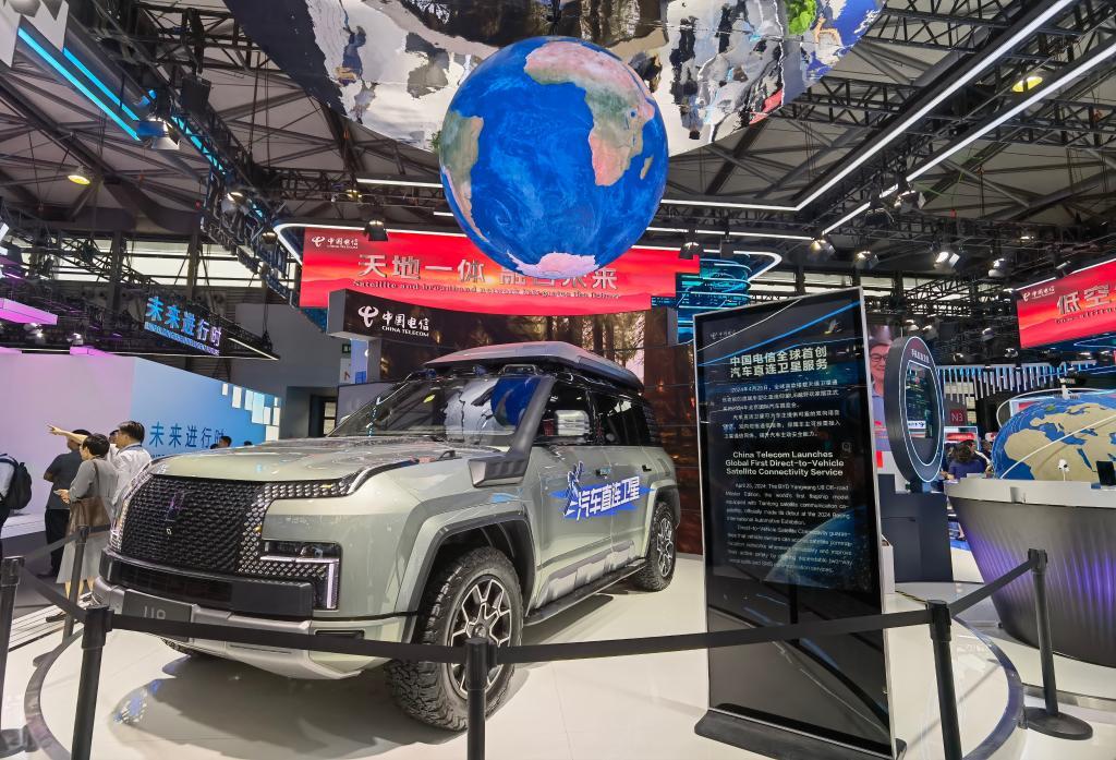 6月26日举办的2024年世界移动通信大会(上海)上,中国电信展台拍摄的汽车直连卫星服务介绍。 新华社记者 陈爱平 摄