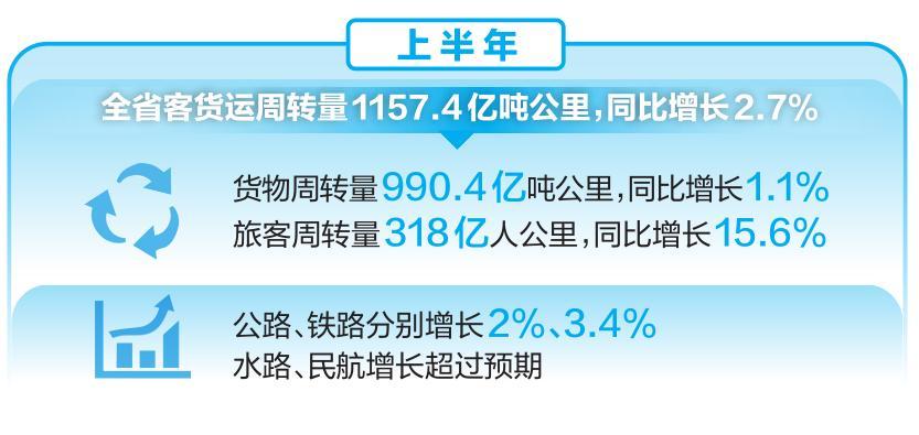 数据显示,上半年,全省客货运周转量1157.4亿吨公里,同比增长2.7%,其中货物周转量990.4亿吨公里,同比增长1.1%;旅客周转量318亿人公里,同比增长15.6%,公路、铁路分别增长2%、3.4%;水路、民航增长超过预期。