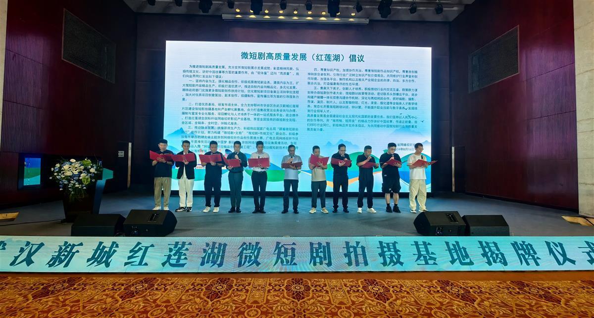 现场番茄短剧、武汉斗鱼、武汉贰拾叁楼、楚天纽麦等10家文化传媒企业负责人,现场宣读并发布《微短剧高质量发展红莲湖倡议》,坚持以人民为中心的创作导向,用“微而精、短而美”的精品力作讲好中国故事、传递正能量。
