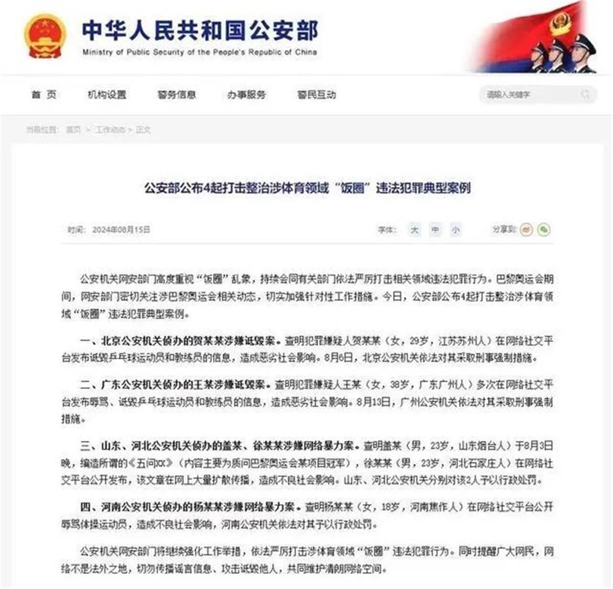 近期,公安机关会同相关部门依法打击整治体育领域“饭圈”违法犯罪行为。对此,中国乒乓球协会8月17日在官网发布声明表示坚决支持,并强烈谴责任何违法犯罪行为。(据8月17日极目新闻报道)