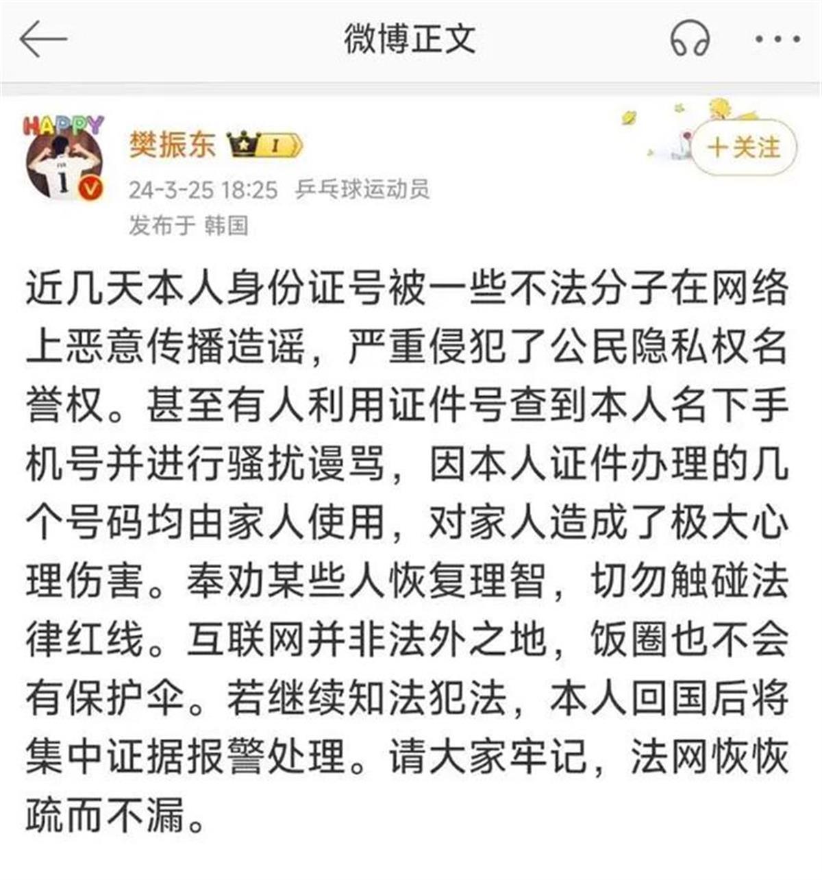 作为运动员的樊振东曾多次通过球迷会、社交媒体平台发表公开信,表示坚决抵制体育被饭圈文化侵蚀,希望球迷尊重自己的生活,尊重自己的教练和队友,不要做应援、打榜、接机,最好的见面时间是赛场上。陈梦也表示,球迷都希望自己喜欢的运动员取得胜利,但是赛场上总会有输赢,希望球迷能正确面对。“希望球迷能更多关注运动员在场上的拼搏精神,以及他们在面对困难时勇往直前的精神。”
