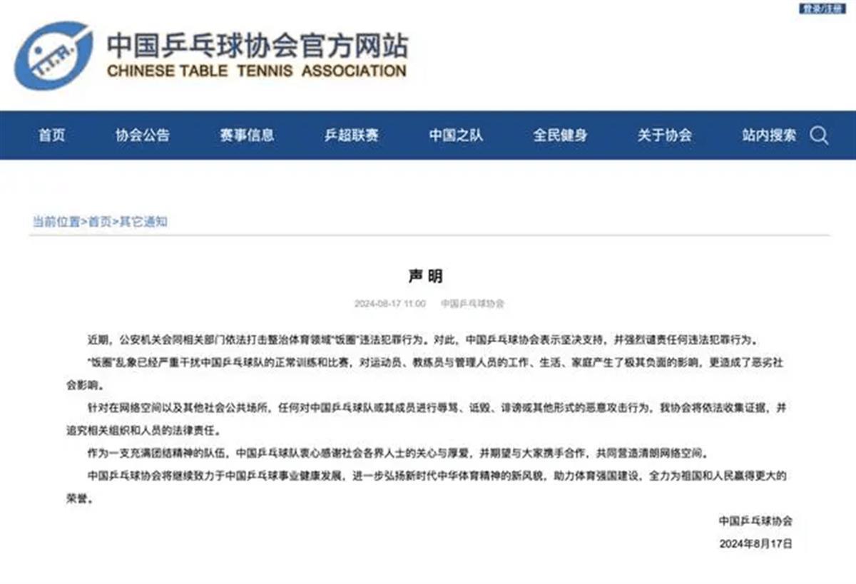 中国乒协的声明(图片来源:中国乒乓球协会)