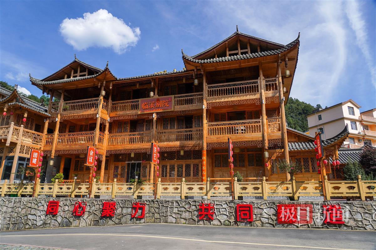 芭蕉河从村落旁蜿蜒而下,一幢三层气势恢宏、纯木质结构、有若飞举之势的飞檐翘角的特色侗族民居临河而建,房子主人将其取名为“临溪别院”,往里面走去,20多栋特色民居错落有致地排列开,嵌在一片片青绿茶园中。