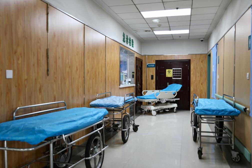 深夜的急诊难得安静。在急诊大厅一隅,放着几辆随时待命的担架车。“我们肯定是希望病人少一点,最好用不到这些担架车。”一位急诊医生说。