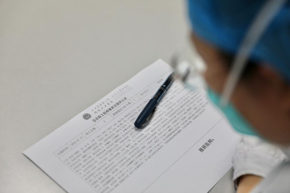 交接完基本情况,两班医生会来到急诊抢救室病房里,对病人的各项数据进一步确认和讨论,完成昼夜之间的最终交接。