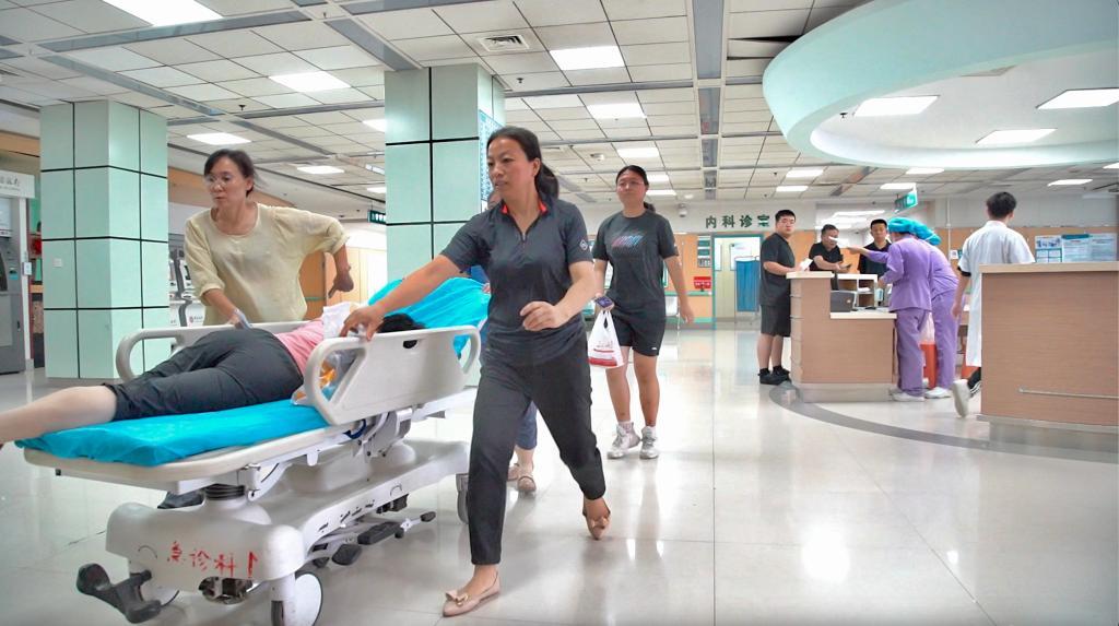在急诊医生的嘱托下,护士与病患家属一起,陪同病患去做脑部CT。在急诊,所有的检查、仪器和设备都是全时在线,时刻守护患者的生命健康。