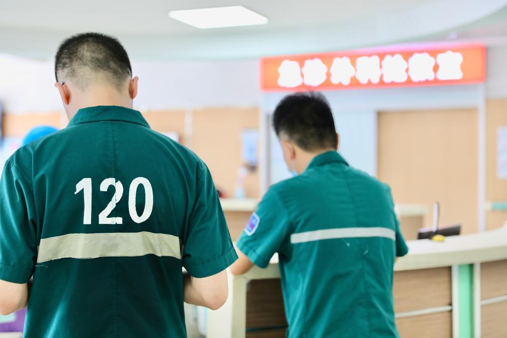 120急救中心人员完成病患的运送后,前往分诊台与护士对接病患信息与情况。与时间和生命赛跑,120救护人员的上衣已被汗水浸湿。