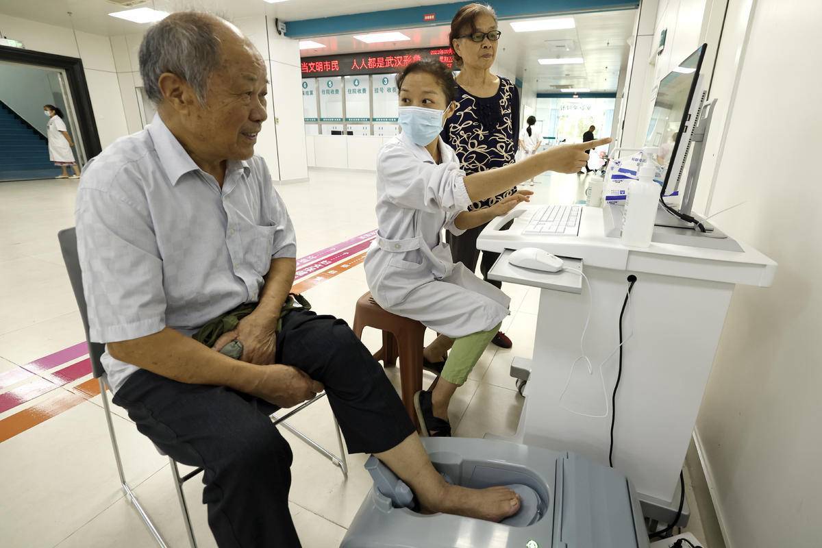 图为在新开诊的吴家山街社区卫生服务中心(东区)医生为老年居民进行检测。(湖北日报全媒记者 倪娜 通讯员 游乐 阮娉 摄)