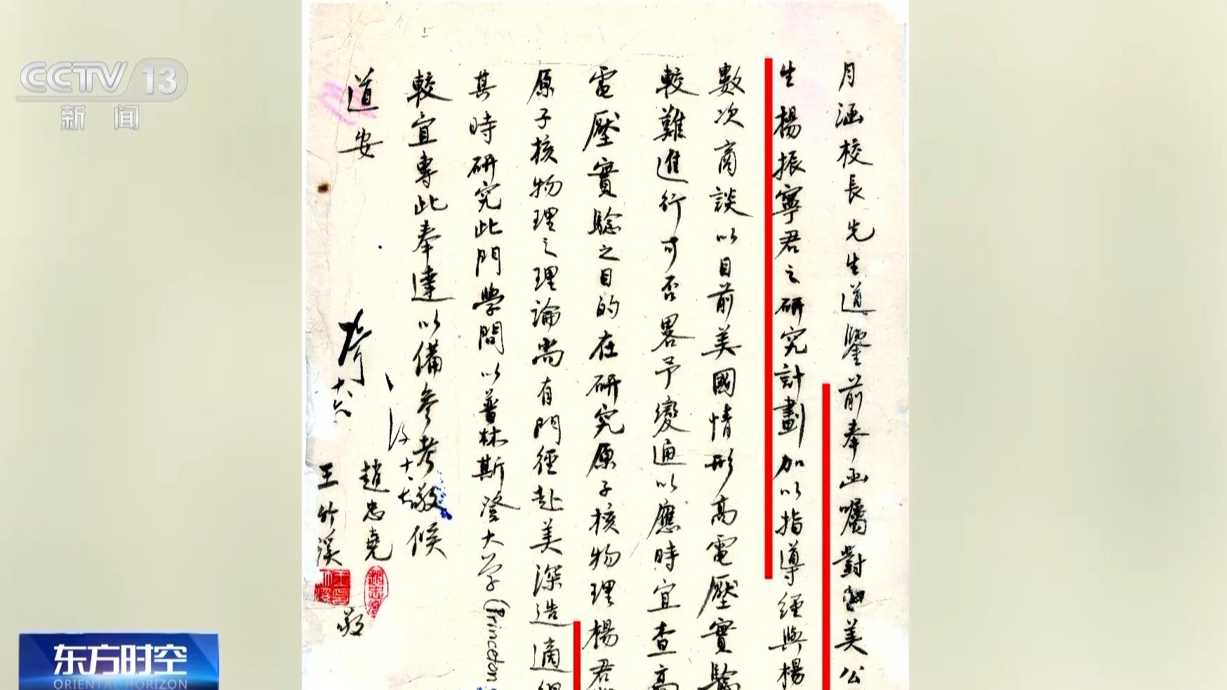 清华大学艺术博物馆常务副馆长 杜鹏飞:杨振宁赴美留学,他其实是想做高电压实验物理,可是两位老师认为他理论物理的功底还是相当有基础的,而且在当时这种高电压实验难以开展难以进行,所以建议他学原子能的理论物理,这个其实非常重要。这封信能够反映出在西南联大时期,当时办学对国家未来的科学发展和技术发展其实它是有所考虑,联大的老师对于物理学的研究实际上也是处于世界前沿的。
