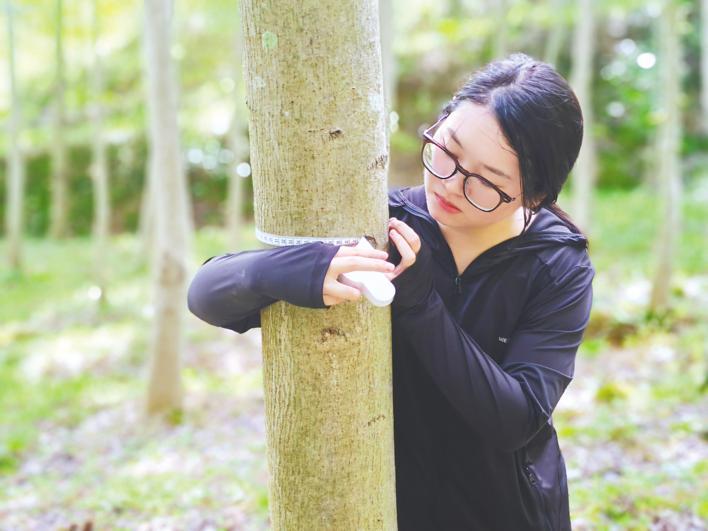王璐正在测量枫香的胸径。