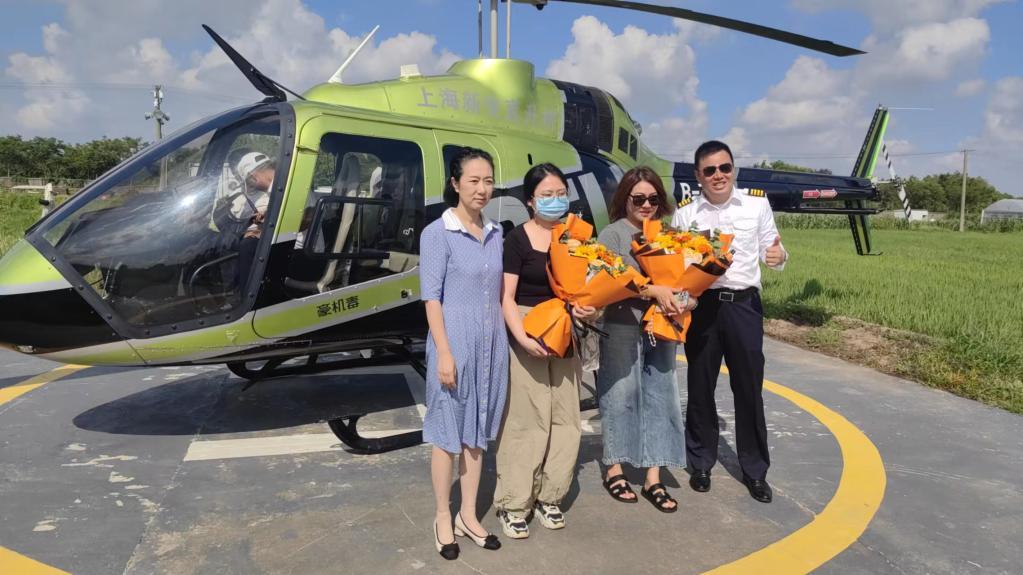 8月18日上午,2名乘客(中间)从昆山乘坐直升机,降落在上海浦东星野飞行基地。新华社记者 龚雯 摄