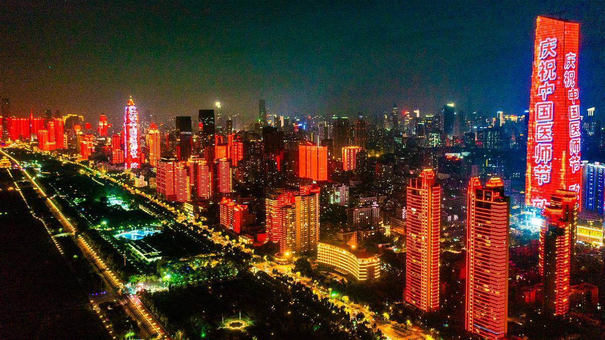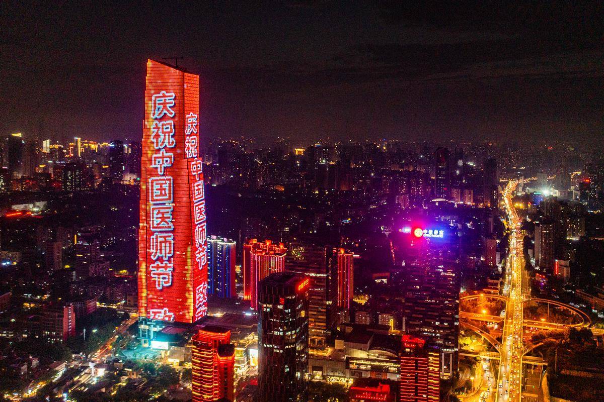 8月19日晚,为庆祝第七个“中国医师节”,“中国医师节”主题灯光秀点亮武汉两江四岸楼宇,向广大荆楚医务工作者致以崇高敬意。2017年,国务院通过了卫计委(今卫健委)关于“设立中国医师节”的申请,自2018年起,将每年的8月19日设立为“中国医师节”。(湖北日报全媒记者何宇欣摄)