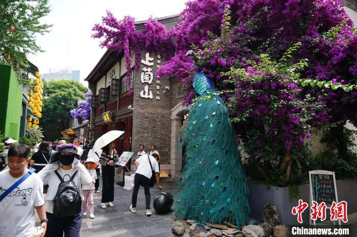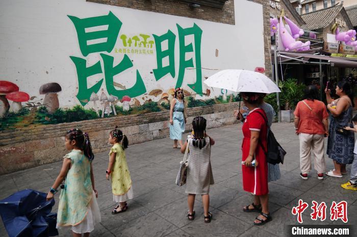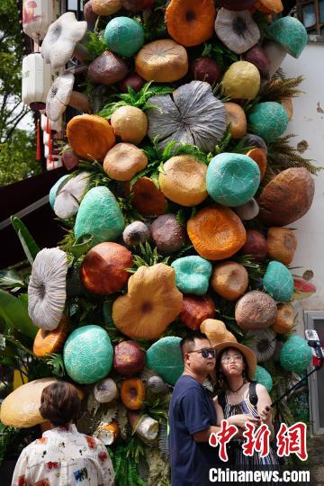 暑假期间,昆明市的历史街区昆明老街成热门旅游“打卡地”,吸引八方来客。图为8月20日,游客在野生菌模型前拍照。中新社记者 刘冉阳 摄