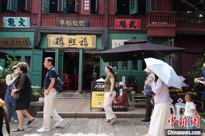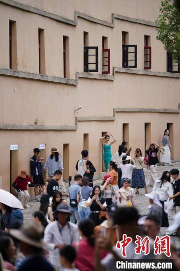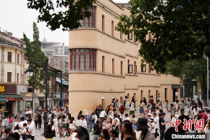 暑假期间,昆明市的历史街区昆明老街成热门旅游“打卡地”,吸引八方来客。图为8月20日,游客在“酒杯楼”前拍照。中新社记者 刘冉阳 摄