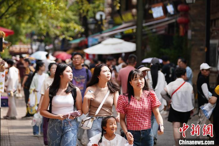 暑假期间,昆明市的历史街区昆明老街成热门旅游“打卡地”,吸引八方来客。图为8月20日,游客在昆明老街游览。中新社记者 刘冉阳 摄
