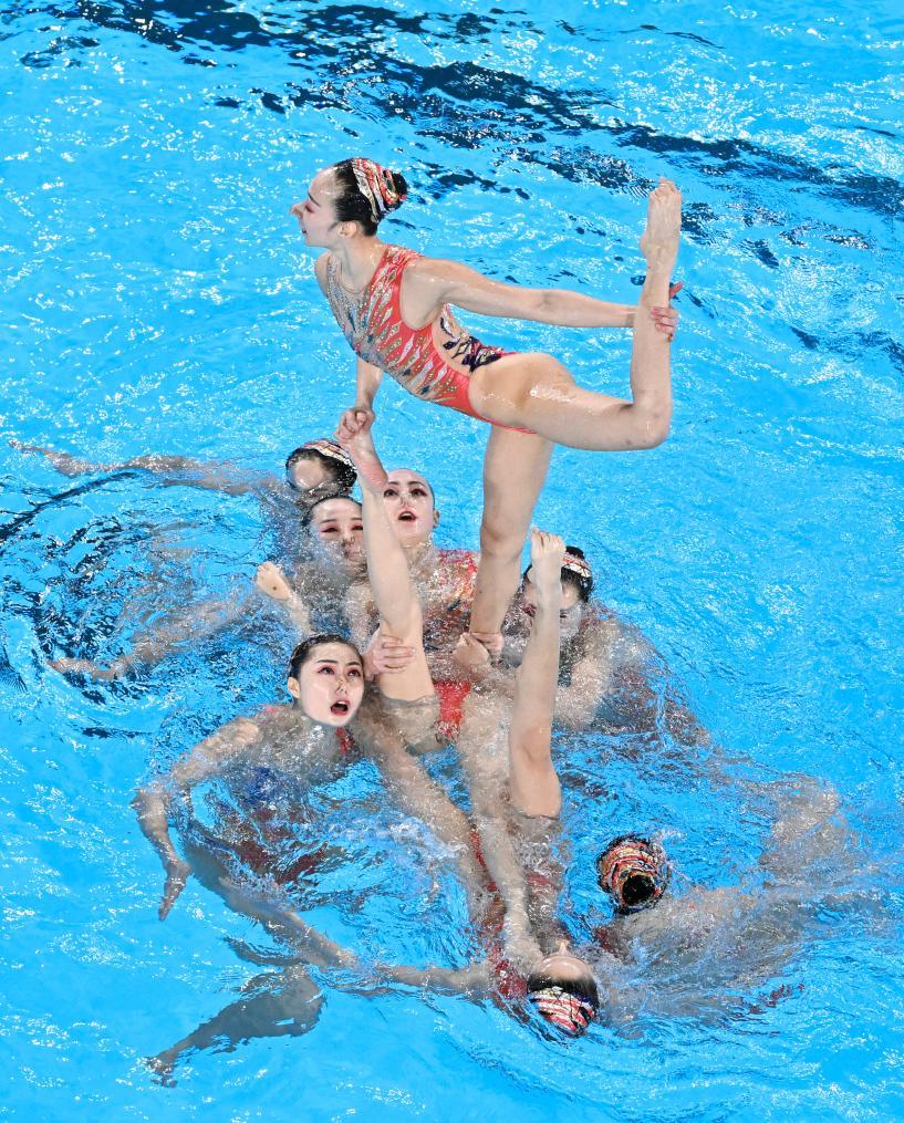 ↑8月7日,中国队在巴黎奥运会花样游泳集体技巧自选比赛中。新华社记者 夏一方 摄