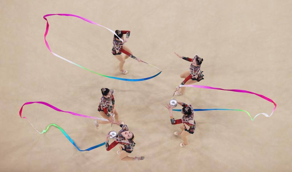 ↑8月10日,中国队在巴黎奥运会艺术体操项目集体全能决赛中。新华社记者 郭昱 摄