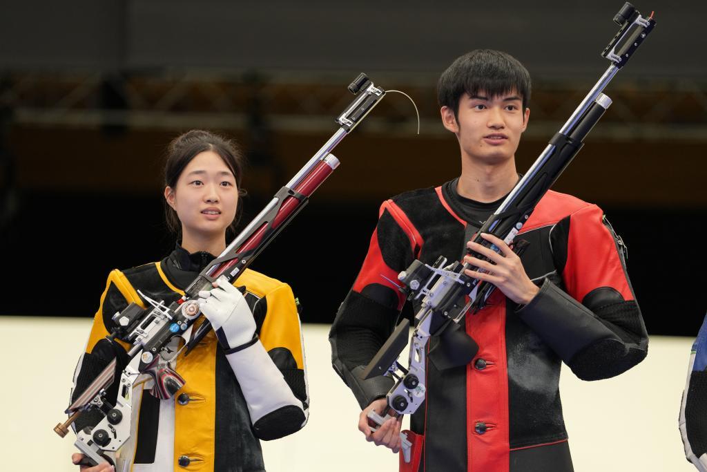 ↑7月27日,中国选手黄雨婷/盛李豪(右)在赢得巴黎奥运会首枚金牌后。新华社记者 鞠焕宗 摄