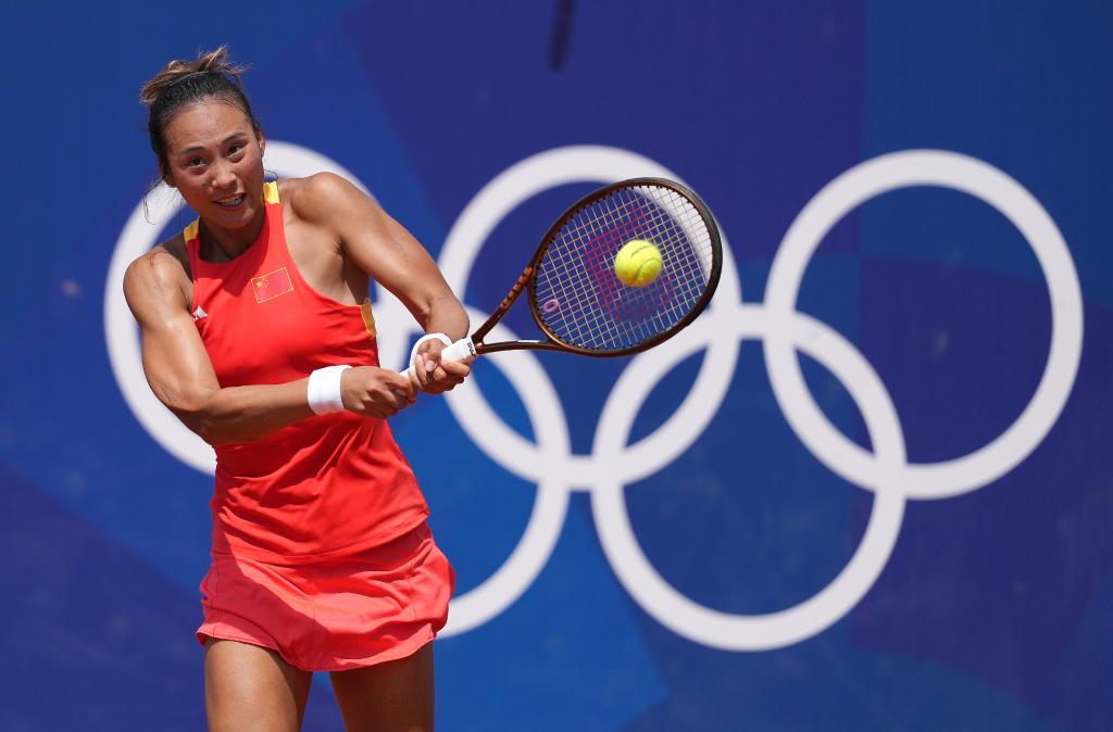 ↑7月30日,郑钦文在巴黎奥运会网球女子单打第三轮比赛中回球。新华社记者 万象 摄