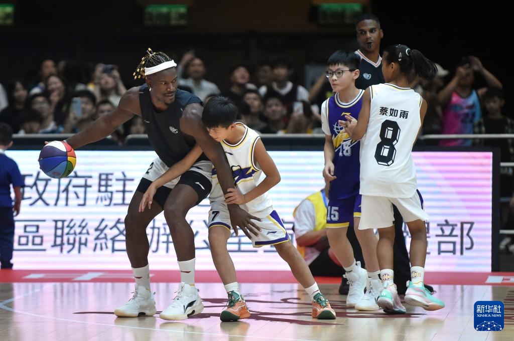 8月20日,国际篮球明星队球员吉米·巴特勒(左一)与小球员互动。新华社记者 卢炳辉 摄