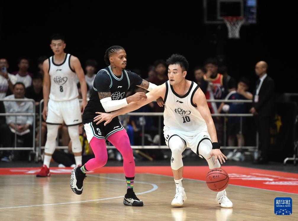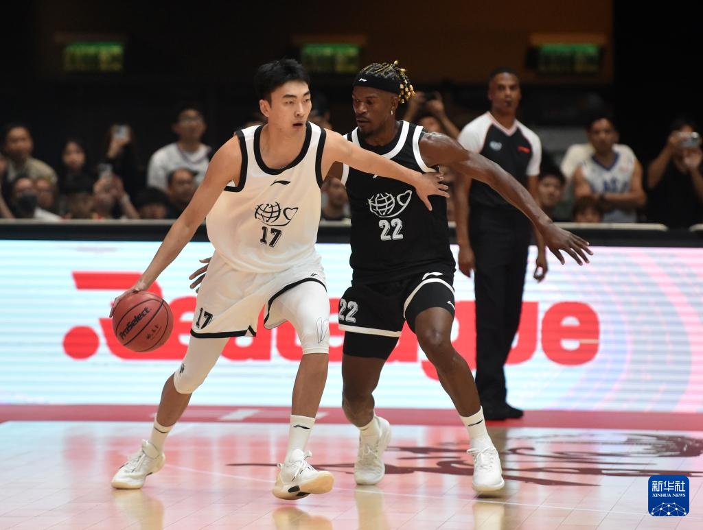 8月20日,国际篮球明星队球员吉米·巴特勒(右)防守中国篮球明星队球员刘雁宇。新华社记者 卢炳辉 摄