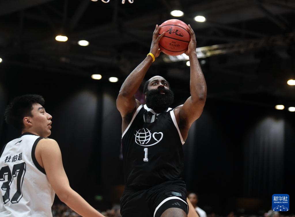 8月20日,国际篮球明星队球员哈登(右)在比赛中上篮。新华社记者 卢炳辉 摄