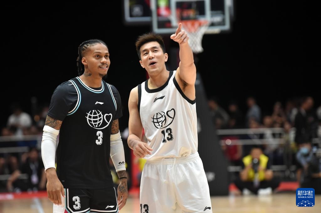8月20日,中国篮球明星队球员郭艾伦(右)与国际篮球明星队球员约瑟夫·杨在比赛中交谈。新华社记者 卢炳辉 摄