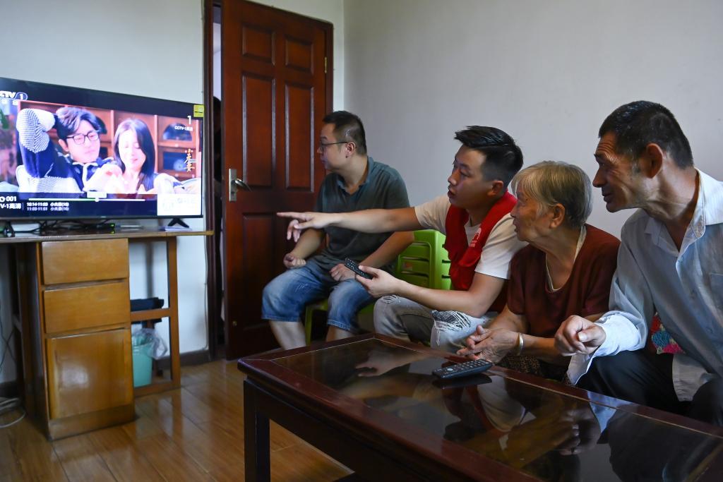 8月20日,工作人员教李淑琴(右二)使用新电视机。新华社记者 邹竞一 摄