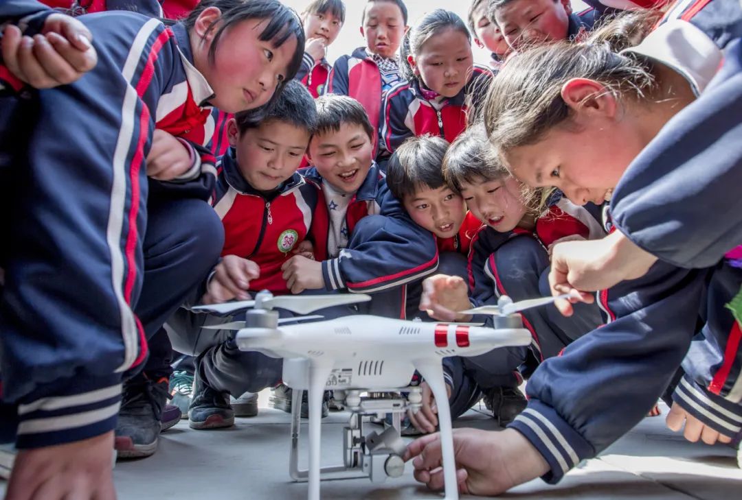 陕西省汉中市略阳县仙台坝小学学生现场体验无人机。