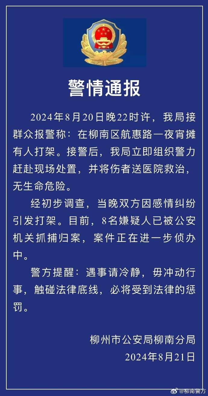 中新网8月21日电 据广西柳州市公安局柳南分局官方微博消息,柳南分局21日发布警情通报称,2024年8月20日晚22时许,柳州市公安局柳南分局接群众报警称:在柳南区航惠路一夜宵摊有人打架。接警后,柳州市公安局柳南分局立即组织警力赶赴现场处置,并将伤者送医院救治,无生命危险。