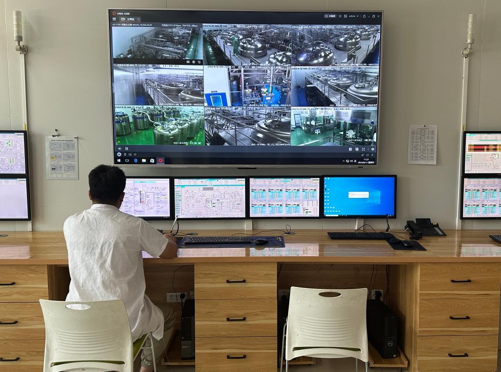 在金宇国际生物科技产业园口蹄疫灭活疫苗车间,工作人员正在进行数据监测。新华社记者王雪冰 摄