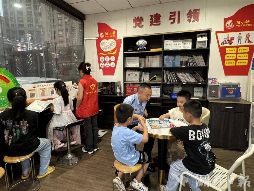 江欣苑社区原本有暑期托管班,但托管时间为9:00至17:30,与夜市摆摊时间冲突。江堤街综合执法中心想到,该社区旁的阳小驿户外工作者驿站24小时开放,有空调、冰箱,还有24小时监控,可以把驿站作为托管场所。
