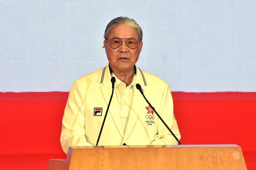8月21日,中国香港体育协会暨奥林匹克委员会会长霍震霆在欢迎仪式上致辞。新华社记者 卢炳辉 摄